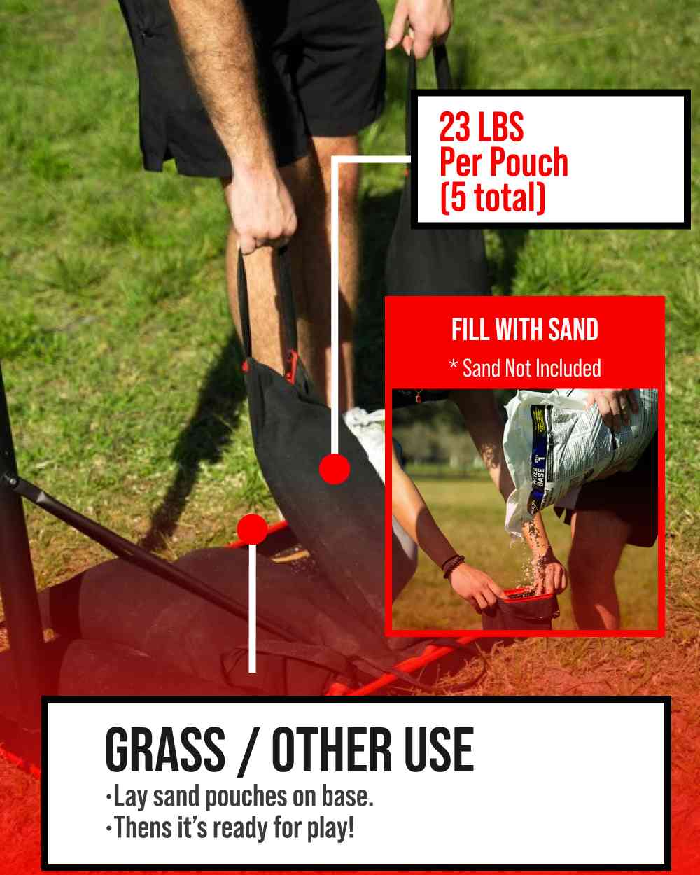 The hoop is designed to fit most round trampolines that are between 12-15 feet in diameter. It comes with a patented system that allows the hoop to be secured to the ground with sand bags, or can be buried completely next to the trampoline. The rim can also be adjusted to different heights, making it perfect for players of all ages.